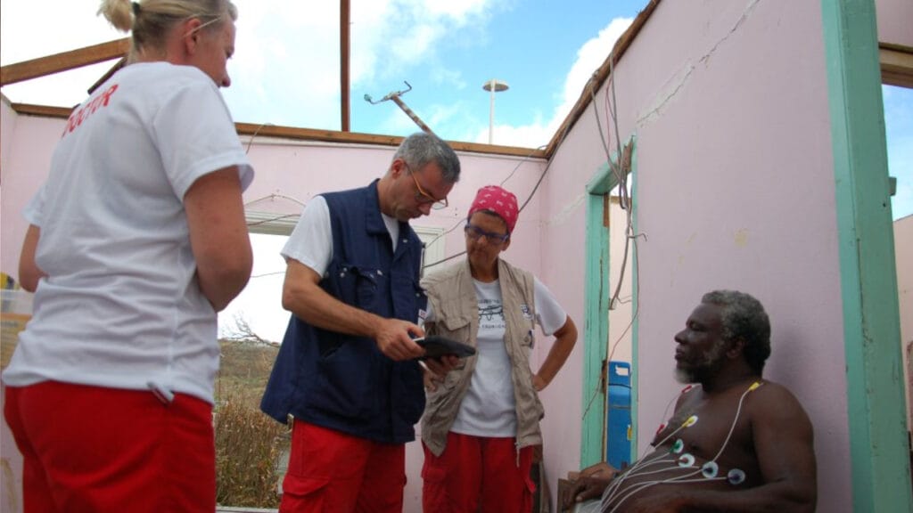 Dans la nuit du 5 au 6 septembre 2017, Irma frappe la Guadeloupe, et plus durement encore Saint-Barthélemy et Saint-Martin. Rapidement mobilisée afin de porter secours aux victimes de la catastrophe à St Martin, notre équipe composée de 2 médecins d’une infirmière et de 9 secouristes a eu beaucoup de difficultés à arriver sur les lieux du sinistre. Après 24 h d’attente à Point-à-Pitre, les membres de notre ONG ont finalement pu bénéficier du pont aérien mis en place entre Saint Martin et la Guadeloupe. Enfin réunis après 3 rotations et l’acheminement de notre fret, notre équipe médicale a pu débuter les soins pendant que les secouristes s’investissaient dans des actions de bâchage et de restauration de toitures. La majorité des prises en charge médicales s’est concentrée sur les conséquences du cyclone sur les pathologies chroniques (hypertension, diabète, …..) pour lesquels les médicaments fournis par notre partenaire Tulipe se sont révélés d’une aide précieuse. De plus, un certain nombre de pathologies psychologiques (stress post traumatique +++) ont pu bénéficier d’une première consultation avant d’être réorientés sur les structures adaptées présentes sur l’ile.